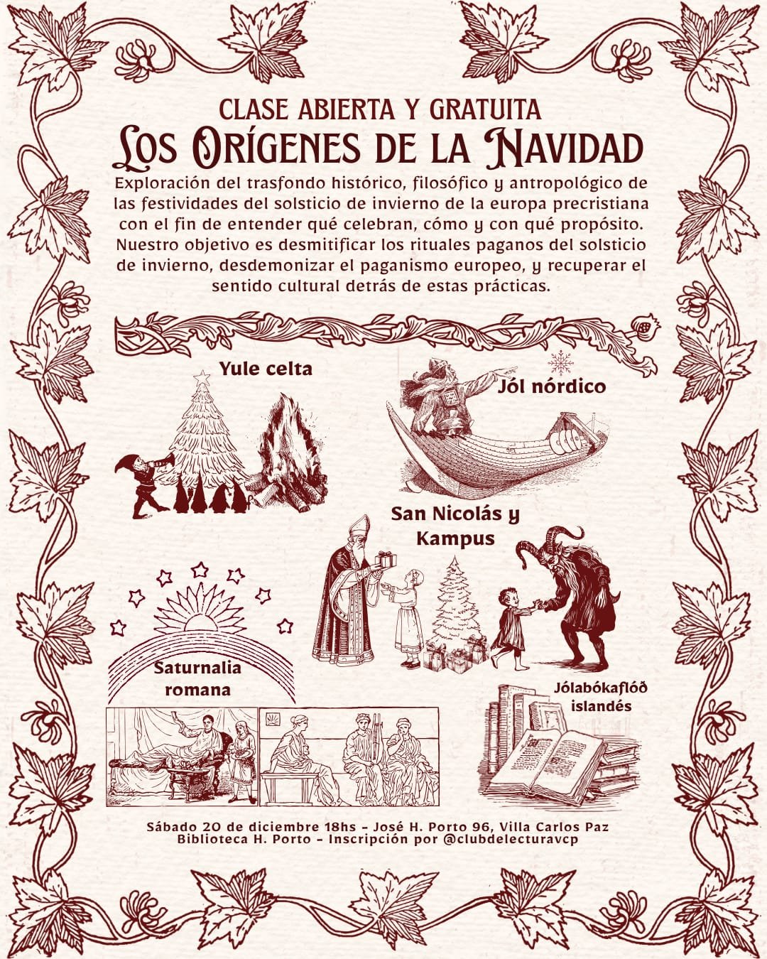 La actividad, organizada por Crónicas Culturales, tendrá lugar desde las 18 horas en la Biblioteca H. Porto, ubicada en José H. Porto 96, y propone un recorrido por celebraciones celtas, nórdicas, romanas e islandesas vinculadas al solsticio de invierno, el momento del año que simboliza el renacer de la luz.
