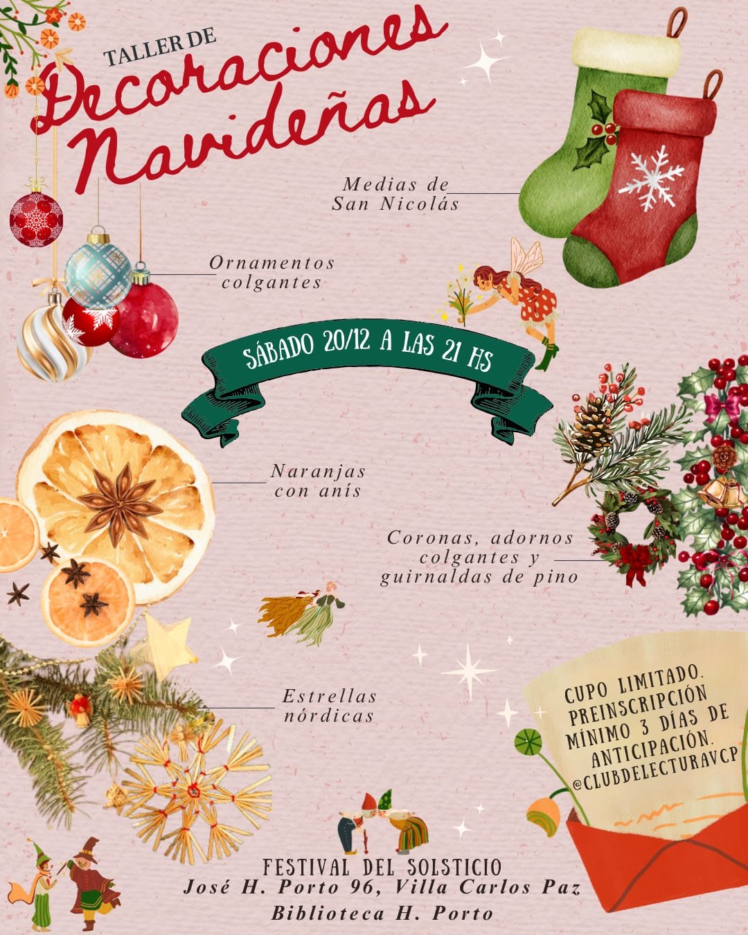 La programación continuará a las 21 horas con un taller de decoraciones navideñas, también con cupos reducidos, en el que se elaborarán medias de San Nicolás, ornamentos colgantes, coronas, guirnaldas de pino, estrellas nórdicas y adornos con naranjas y anís, utilizando materiales reciclados y técnicas tradicionales.